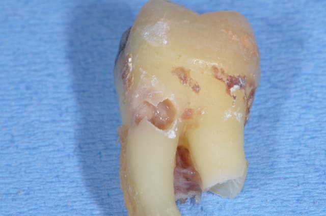 C'est une image typique de résorption externe, ci joint un cas récent d'un confrère qui me demandait mon avis également sur le même type de lésion, il m'a transmis la photo de la dent après l'extraction. La décision d'extraire a été prise car une atteinte osseuse de la furcation commençait. La dent était elle complètement asymptomatique et répondait tout à fait normalement au test de vitalité, car la résorption externe préserve en général le tissus pulpaire