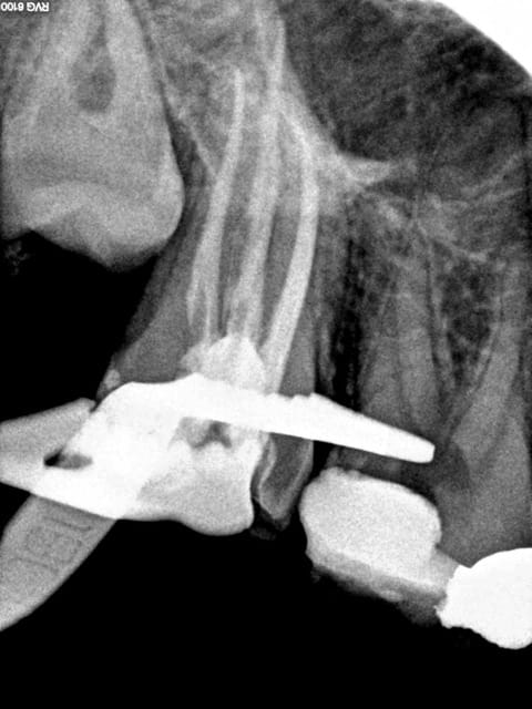 Endos + raser le secteur postérieur haut, rétablissement d'un plan d'occlusion correct avec de la fixe + Stellite bas.