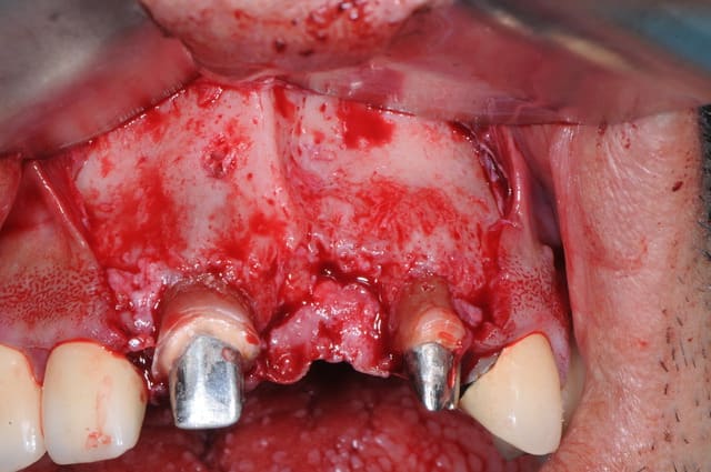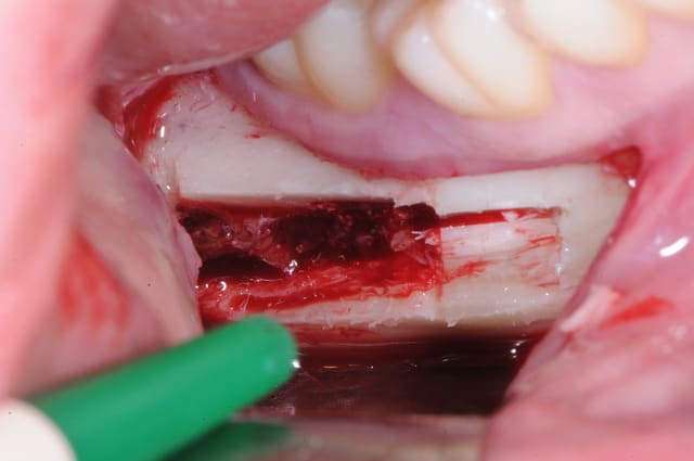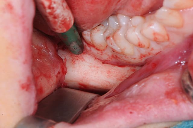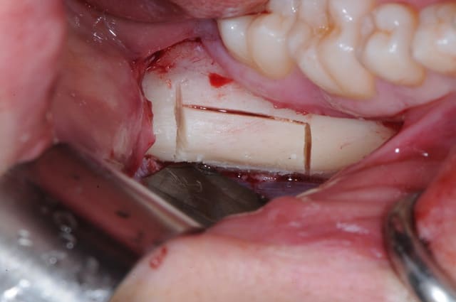 Oui, comblement uniquement autogène. Le site de prélèvement (rétro-molaire) et le bloc ont été safescrapés ce qui donne beaucoup de copeaux.