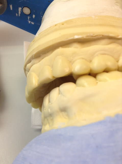 - j'ai fait une maquette provisoire du bloc antérieur pour l'esthétique (meme si je pense qu'il faudra encore rallonger un peu les incisives pour que le plan d'occlusion "esthétique" de face suive la courbure de la lèvre inférieure ) ;