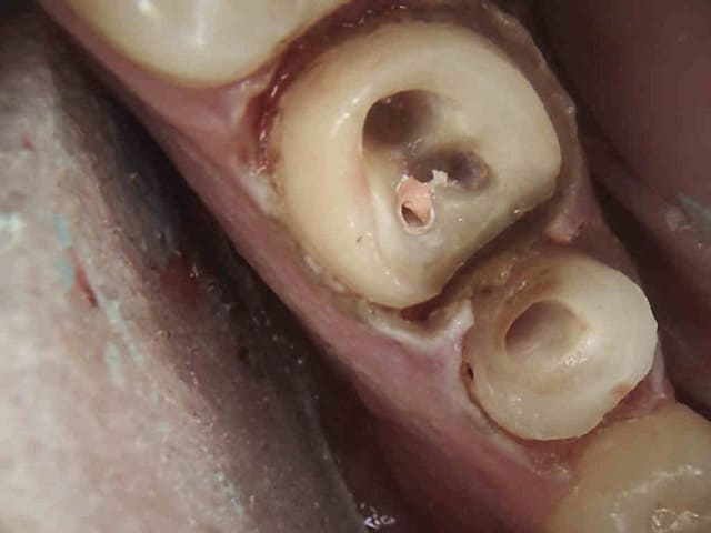 Fêlure mesiale et distale, le curetage n'est pas complet sur l'arrête restante.
