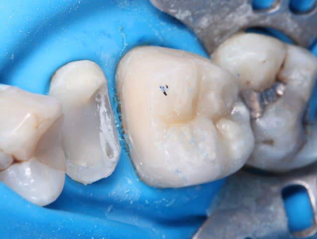 Temporisation : grosse patate de TELIO isolée de la prépa à la glycerine, qui tient dans les espaces interdentaires. Le proto me sort les onlays compo sous trois jours.