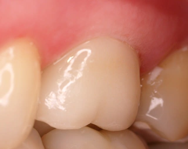 Autre cas de figure, le patient avec brossage iatrogène, tu descends toujours plus bas, mais la brosse glisse sur la paroi vestibulaire et attaque la gencive marginale (pour le savoir il faudrait voir les autres collets chez ce patient), là le meilleur dentiste n'y peut rien sauf si il arrive à le convaincre de changer de méthode de brossage.