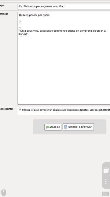 Utilisateur de Puffin (version complète) sur iPad Air , je confirme la présence du bouton envoyer des pièces jointes.
