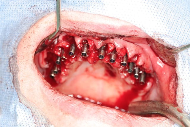 je ne vais pas discuter le nombre d'implants qui n'est pas forcément un problème lorsqu'ils sont précisément posés et de diamètres corrects pour éviter une trop grande proximité entre-eux ce qui est le cas ici.