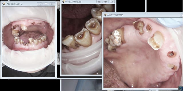 pano initiale et planche 3D montrant qu'en fait les molaires ne tenaient quasi plus que par les racines palatines...