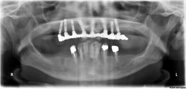 Actuellement j'ai un an de recul sur un cas mixte maxillaire (2 ptérygoidiens et 8 non scellés ni transvissés)je croise les doigts je dirai que c'est ma plus belle réalisation. Il apporte la preuve de la non mobilité du bridge sinon j'aurai perdu depuis longtemps les implants pterygoidiens c'est sûr.