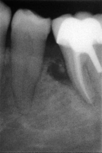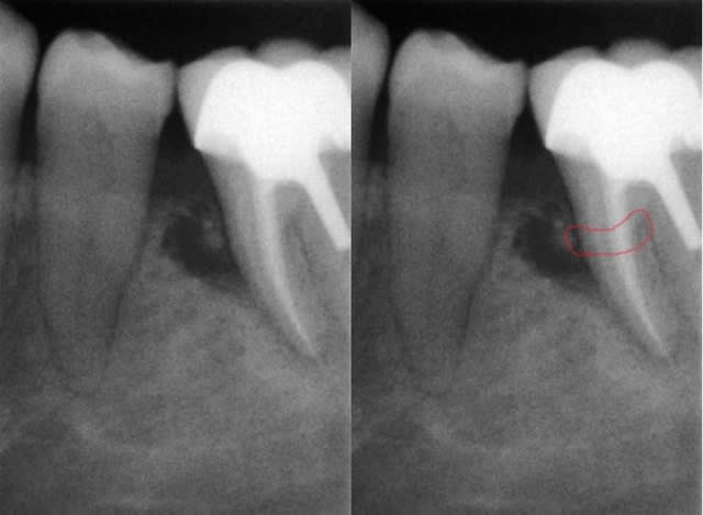 Je veux pas dire mais le dépassement en mésial a pourvu l'os en germe et on a une infection qui remontre depuis l'apex vers le haut, après un autre élément se surajoute, à voir du côté de ce qui a été écrit plus haut.