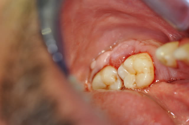 Même gueule chez un patient que je suis depuis 3-4 ans entre 46-47 avec une poche , une hygiène interdentaire inexistante et une à la brosse limitée. Patient de 80 piges, pas la grande forme (probable anémie latente cf couleur gencives mais ras de prononcé en NFS), revu il y a peu j'ai évoqué mes doutes avec lui, puis ai décidé de ne rien faire compte tenu du bénéfice qu'il retirerait de faire une biopsie et de tomber sur un hypothétique mais très incertain cancer. Sur le long terme pas de changement d'aspect ni de volume, je doute donc fort d'un état cancéreux, pas de saignement spontanées non plus. Je dirais hyperkératose anarchique localisée, réactionnelle à un trauma répété, sans certitude.