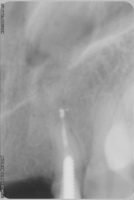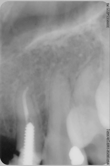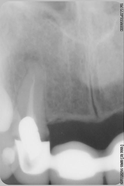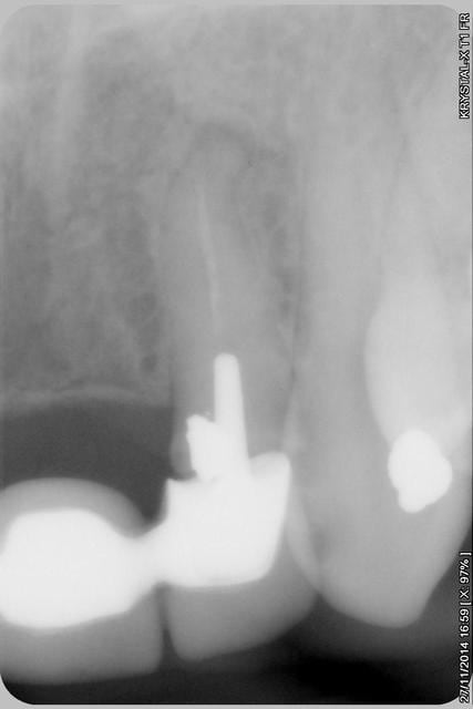 ensuite Srew post (bouh...) et résine, afin de pouvoir poser un provisoire et réfléchir à l'avenir du parodonte...car il va y avoir un problème quelle que soit la solution choisie.