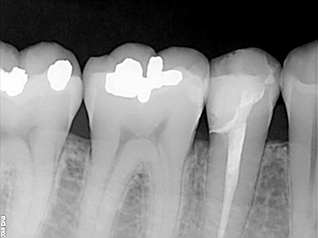 La radio montre un très fin hiatus en cervical au niveau du joint dent-inlay montrant probablement que l'inlay n'était probablement pas à fond à cause du contact trop fort.