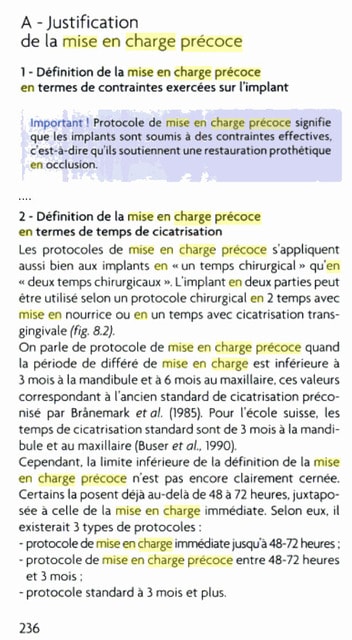 Dans le Manuel d'implantologie clinique: Concepts, protocoles et innovations récentes. Par M. Davarpanah, Serge Szmukler-Moncler, Ed. 2008 : page 236. Image ci-jointe du § à propos des définitions : Mise en charge précoce...