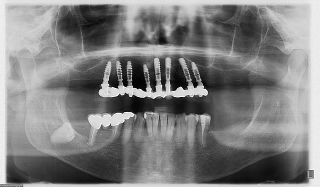 C’est un cas d’extraction implantation et mise en charge immédiate. Le bridge provisoire est en résine sur une armature métal rigide. Cette armature à un rôle de fixateur externe qui réparti les contraintes sur tous les implants. Nous obtenons ainsi une stimulation intra-osseuse favorable à la cicatrisation de cette zone. Après 1 an de port, le cosmétique enregistreras les pistes d’occlusions, cette information est importante pour la réalisation du bridge d’usage.