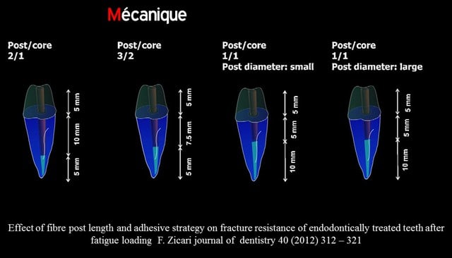 Un tenon fibré, doit être plus court. Car on colle bien sur les premiers millimetre, que son module comparable à la dentine ne provoquera pas une fracture, que ainsi la dépose est plus simple...