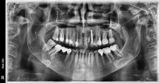 En 23 on a un implant qui semble bien ostéo intégré même si on remarque une forte perte osseuse sur la 24 mesial qui vient contaminer l'implant.