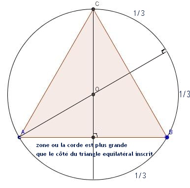 Cette méthode aléatoire, prise sur un tres grand nombre d'essais se rapprochera idéalement de la probabilité de la longueur de corde supérieure a la corde décrite par un des cotés du triangle équilateral.