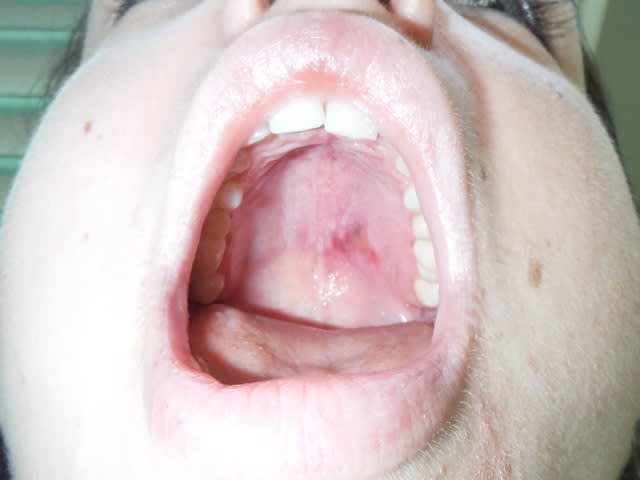 Mlle D 23 ans,reçu en consultation pour douleur sur toute la partie gauche du palais, est sous Voltarène, 28 sous muqueuse. Elle a été vu 5 jours plus tôt par un confrère pour "une grosseur au palais", le diagnostic envisagé fut "gros aphte".