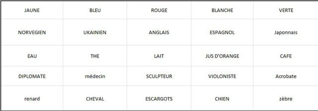> Cinq maisons alignées et de couleurs différentes sont habitées par des hommes de