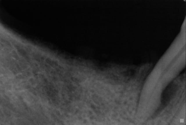 une patiente qui présente une lésion sur le coté mésial de la racine de 43, il ne s'agit pas d'une lésion paro, en tout cas au sondage impossible de rejoindre la lésion.