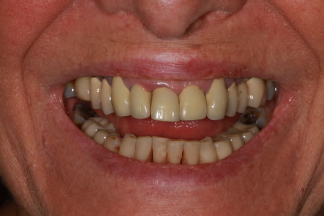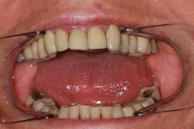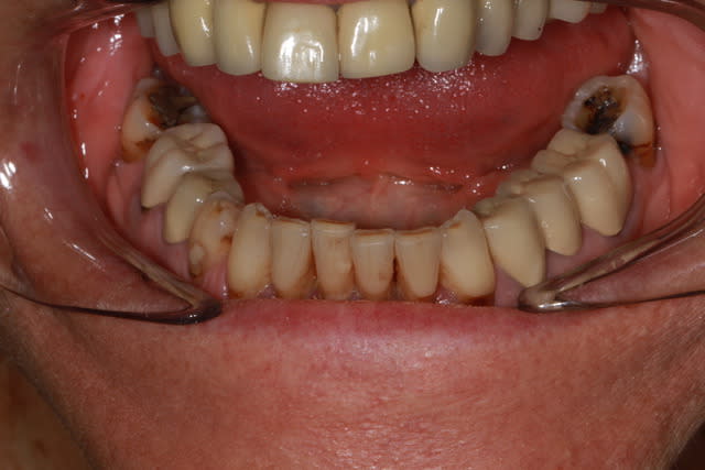 C'est sûre que quand on voit la différence qu'il y a au niveau du parodonte entre la maxillaire sup. et le maxillaire inf., l'usure de certaines dents, et la mauvaise adaptation de certaines couronnes, on est fortement incité à penser à une cause iatrogène...