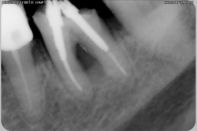 Nettoyage, curetage inter-radiculaires,lavage à l'hypochlorite, obturation (sans la digue) 3 screws post (en prévision d'une éventuelle séparation de racine)après avoir bouché la perforation à la bio dentine, recouverte d'un composite.