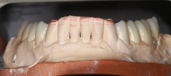 Si la solution me semble viable, je vais dans une série de séances "longues" (de 2, 4 6 ou 8 heures) déposer l'ensemble des couronnes faire les soins et ensuite me servir de mon waxup pour poser des provisoires.