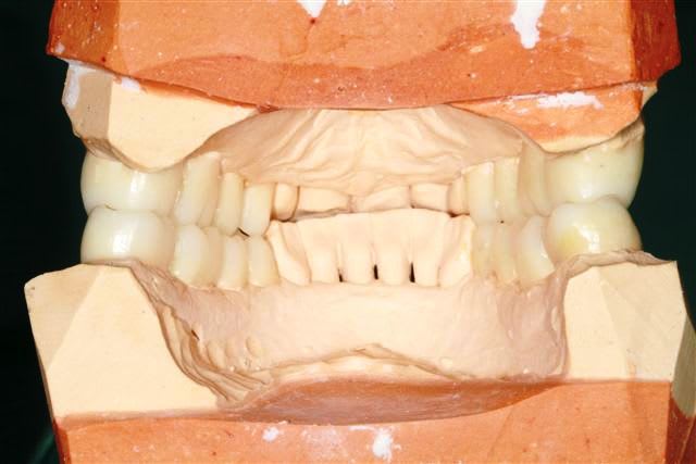 ce matin, grosse séance (4 h), pour le bas dépose des couronnes retraitement, taille et provisoires pour secteur 3 et 4 d'après le waxup, puis équilibration (le haut ne correspond pas encore), et bien désolé de te décevoir enlaye, mais les waxups donnent un résultat tip top...