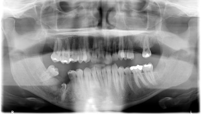 patient adressé au stomato en début d'année pour extraction de 18 28 38 47 46. Je vous montre les 2 panos. implant 26 prevu, doit se décider encore sect 4 sachant que le 45 est a couronner. J'ai revu le patient vendredi 3 mois après l'intervention pour la première fois,qui me dit qu'il n'a plus du tout de sensibilité région mentonnière et cliniquement pas très joli sect 4. Rien de particulier ds le compte rendu opératoire du stomato.