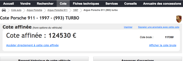 C'est pas croyable. Il y a 2 ans j'étais en quête d'un petit plaisir et j'étais tombé par hasard sur la Centrale sur MA Porsche (@hypolyte les 993 bi turbo ne courent pas les rues on ne peut pas dire que ca soit une production de masse !) ) alors en vente à 65 000 euros, ca m'avait déjà passablement énervé, mais 120 000 euros aujourd'hui c'est du délire ! En 2 ans que s'est il passé ? On a plus confiance dans le système bancaire ?