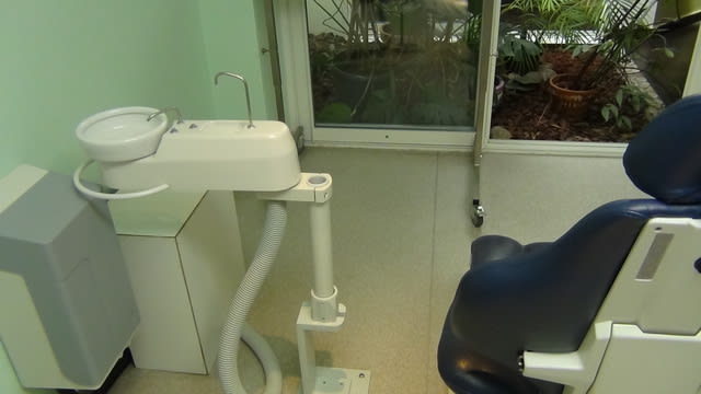 Le crachoir (je sais, je sais) fixé sur une embase au sol qui permet de le dégager complètement dur la gauche et de passer la table pont au fond..