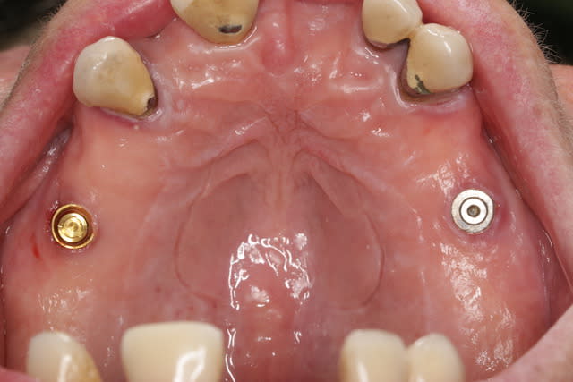 Ca ressemblerait à un 3i Certain en 5mm, cependant chez 3i les faces sup. des plateformes implantaires sont anodisées (jaune pour le 5mm), et pas là, mais peut être que la pièce femelle du Locator (toujours en place dans la prothèse amovible de la patiente, et en fonction) a usé cette surface?