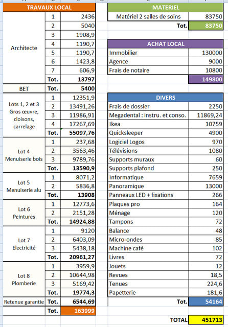 Cabinet avec achats de murs anciens, gros travaux, 2 salles de soins, matériel neuf.
