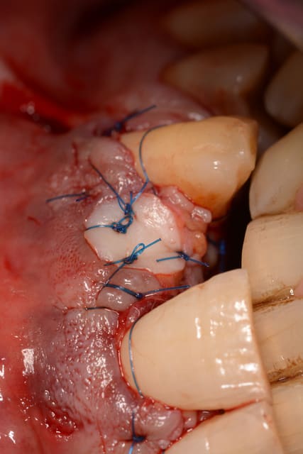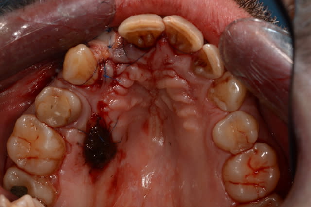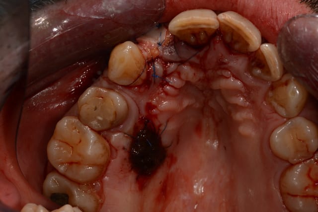 extraction curetage, pose d'un bloc biobank cortico-spongieux et poudre d'os biobank, membrane at collagene et patch palatin pour fermer le lambeau.