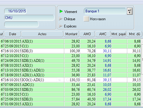 J'ai cliqué sur l'icône cpam-amo et effectivement j'y retrouve mes patients avec cette fois ci l'AMO en montant Dû. Mais si je valide via les 2 rubriques ( cpam amo pour l'amo, cmu pour l'amc) je me retrouve avec 2 écritures comptables au lieu d'une...et c'est fastidieux.