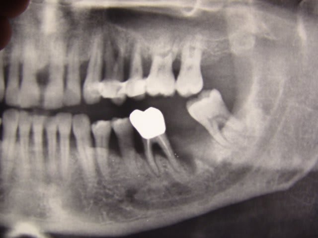 D'après l'hémi-radio, le père de ton pote semble avoir des dents plutôt indemnes de caries et de soins, son extraction est donc due à de sérieux pbs paro (abcès, mobilité)à priori.