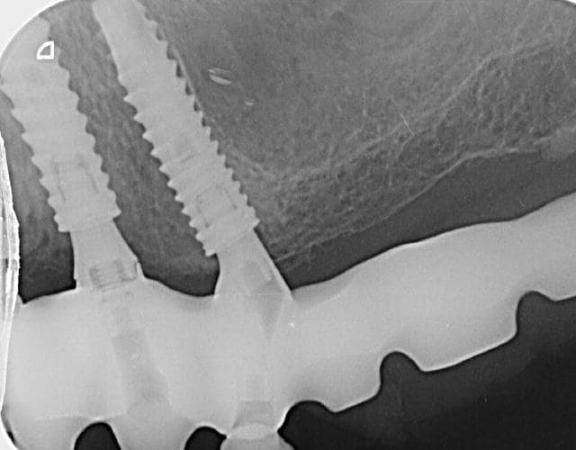 Va falloir faire un traitement canalaire, cet implant a un granulome à l'apex :-))))
