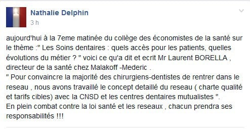 > Au moment où MPST se bat contre les réseaux de soins conventionnés, je ne comprends pas la position de la CNSD alors même que tu es la porte-parole des chirurgiens-dentistes dans ce Mouvement, d’autant plus que l’adhésion à Kalivia avait été rejetée par ton congrès, en mai 2015 comme nous l’a rappelé Jean Pierre GALLET.
