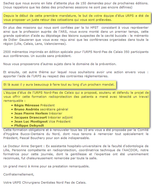 C'est une information sur la soirée Pcr du 12/11 ? Soit. Pourquoi alors cette communication sur les actions passées (plan cancer) ? Pourquoi parler d' actions à venir alors que les élections approchent et qu'une nouvelle équipe sera élue ? Pourquoi ne pas avoir cité les autres membres urps ? Pourquoi m'avoir adressé cette lettre 2 jours avant le début de la campagne officielle alors que je n'ai pas participé à l'évènement et qu'aucune autre date n'est prévue ? Pourquoi sur les 6 personnes citées, 5 sont candidates sur la liste CNSD? Pourquoi ce remerciement special à Pascal Bouchery lui aussi sur la liste CNSD ? Si c'est le hasard, il faut jouer au loto. Mais de grâce, arrêtez de prendre les confrères pour des imbéciles.