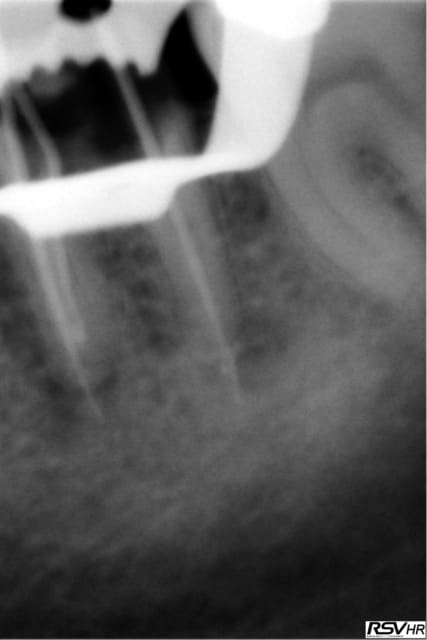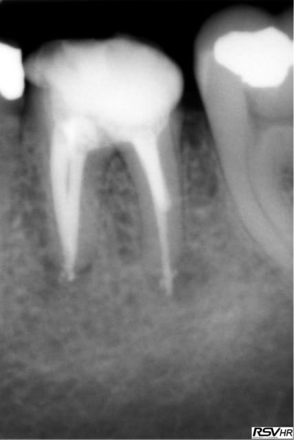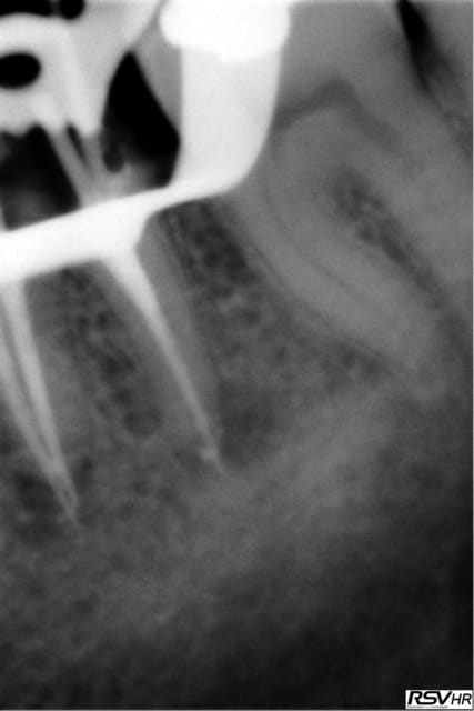 ici traitement sous hypo+digue +r-endo;il y a un dépassement léger au périapex