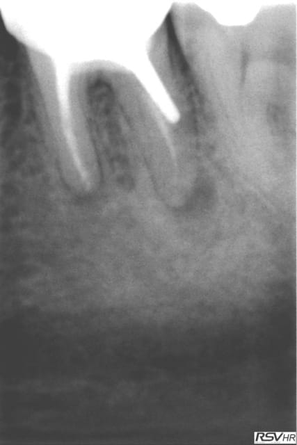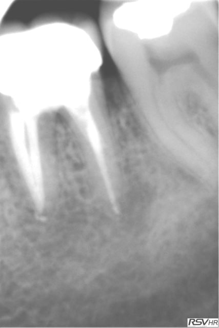 ici traitement sous hypo+digue +r-endo;il y a un dépassement léger au périapex