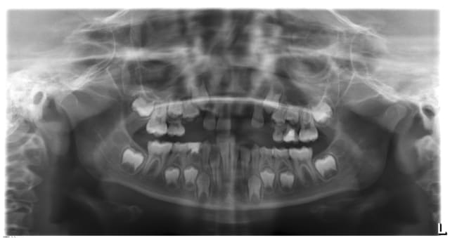 J'attendrai l'éruption des canines permanentes avant d'envisager un bridge collé. Pour le moment, je ferai un arc palatin avec 2 bagues scellées sur les 6 et une dent prothétique.
