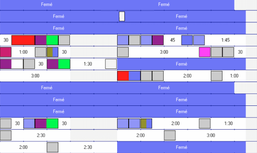 Ci joint mon agenda des 2 semaines à venir, en gris c'est les poses de prothèse vert violet taille empreinte bleu clair consult bleu foncé amalgame rose composite et blanc violet empreinte secondaire occlusion .
