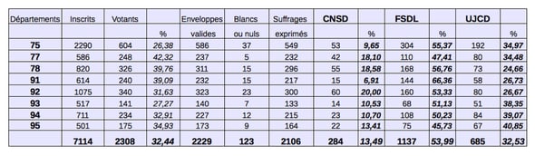 En région Midi Pyrénées/Languedoc Roussillon, nous obtenons 6 élus (33,5%), 3 pour l'UJCD (18,82%) et 9 pour la CNSD ( 47,68%).