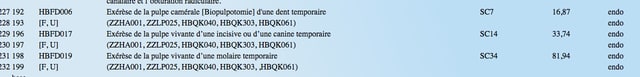 16,97 euros pour la pulpotomie ( HBFD006) VS 81,94 pour la pulpectomie (HBFD019)