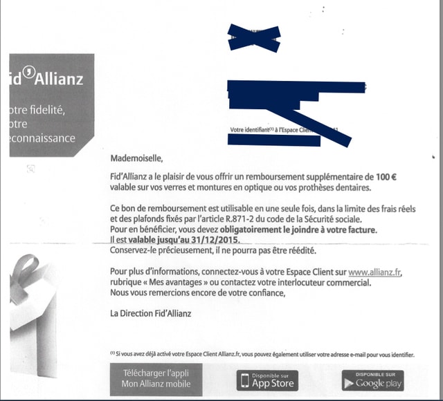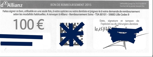 -un bon de 100 euros "utilisable une fois dans la limite des frais réels" Date limite 31 12 2015 ( comme ca si la vieille n'est pas réactive elle l'a dans l'os)
