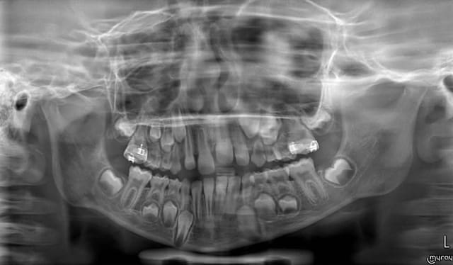 il y a envron 1 an le jeune Ethan 8 ans tombe dans la cours de l'école et se retrouve avec les incisives reingressées a mi-couronne (alors que selon les dires de la maman elles etaient completement évoluées), malheureusement les enseignants pensant que les dents étaient entrain de pousser n'alertent pas les parents.