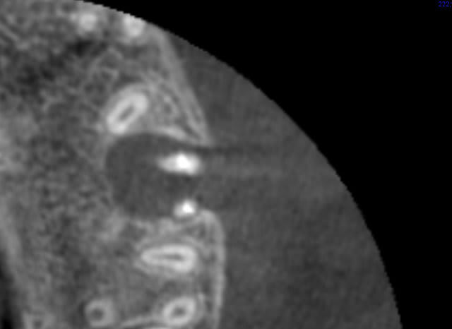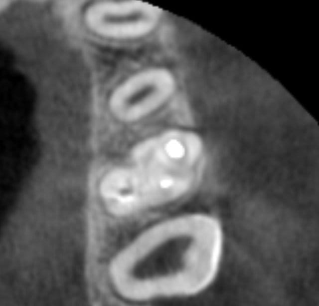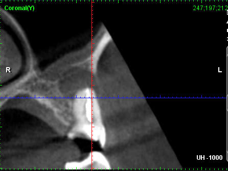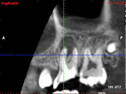 Pour notre culture et le suivi, meme si tu t'orientes vers l'extraction (reprendre endo apres chirurgie bof!), comme pointG te l'a suggéré, peux tu nous donner quelques autres plans de coupe (en avant et en arriere) pour voir si l'on a deux mésiaux ou un mesial large comme la 17 (avec les pieges de subdivision canalaire)?