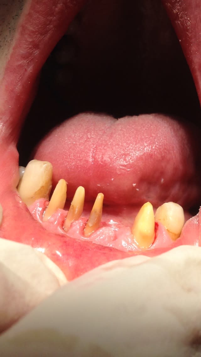 Là je suis aux provisoires : sur la photo je lui ai fait des provisoires trop longues, j'ai déjà raboté tout ça et j'ai enlevé 3 mm de hauteur pendant une autre séance