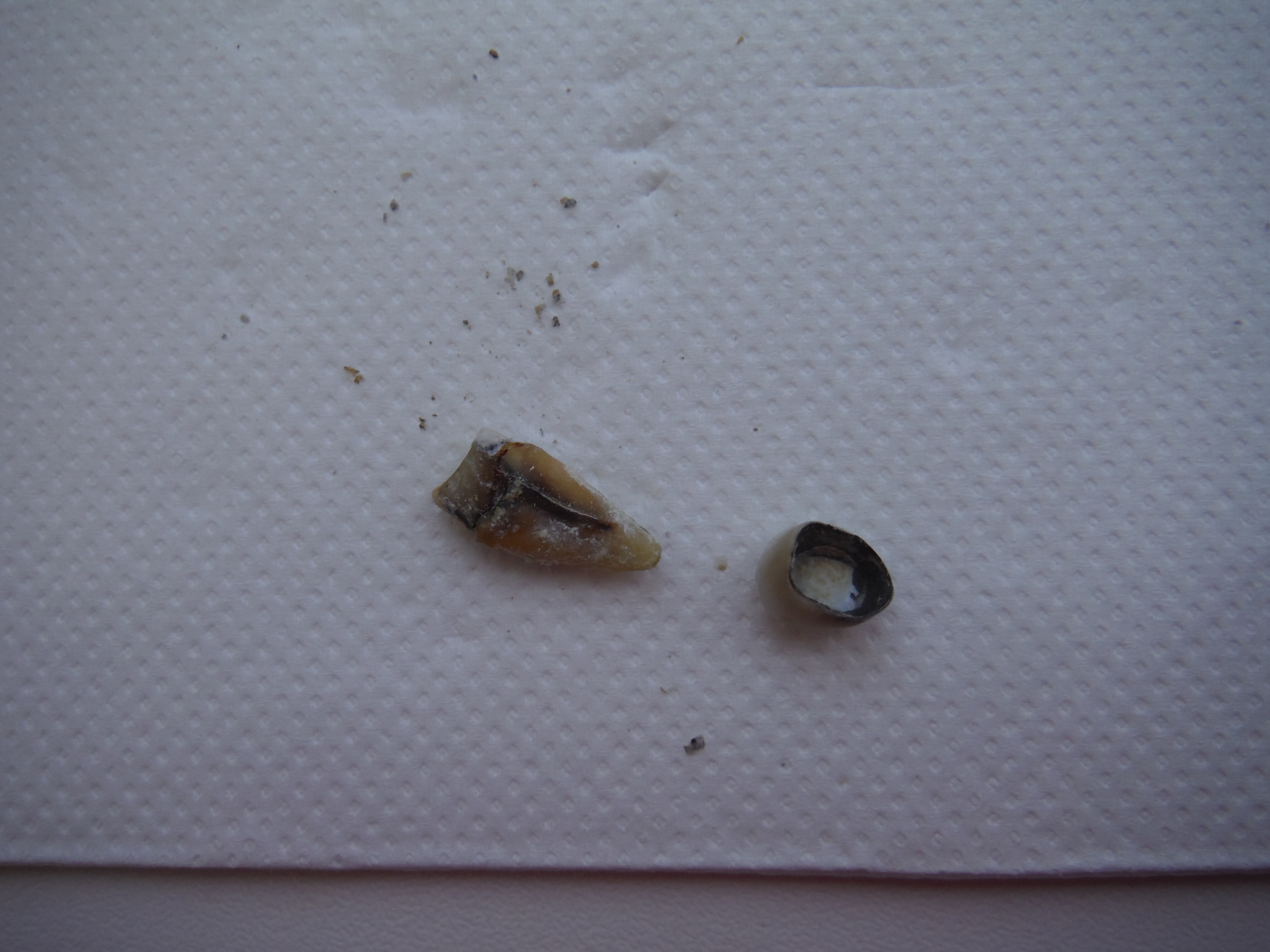 Exo et zolie fêlure de l'apex à la couronne prothétique, c'était bien la peine de ne pas avoir mis d'IC ou de tenon afin de prévenir ce risque :-)))