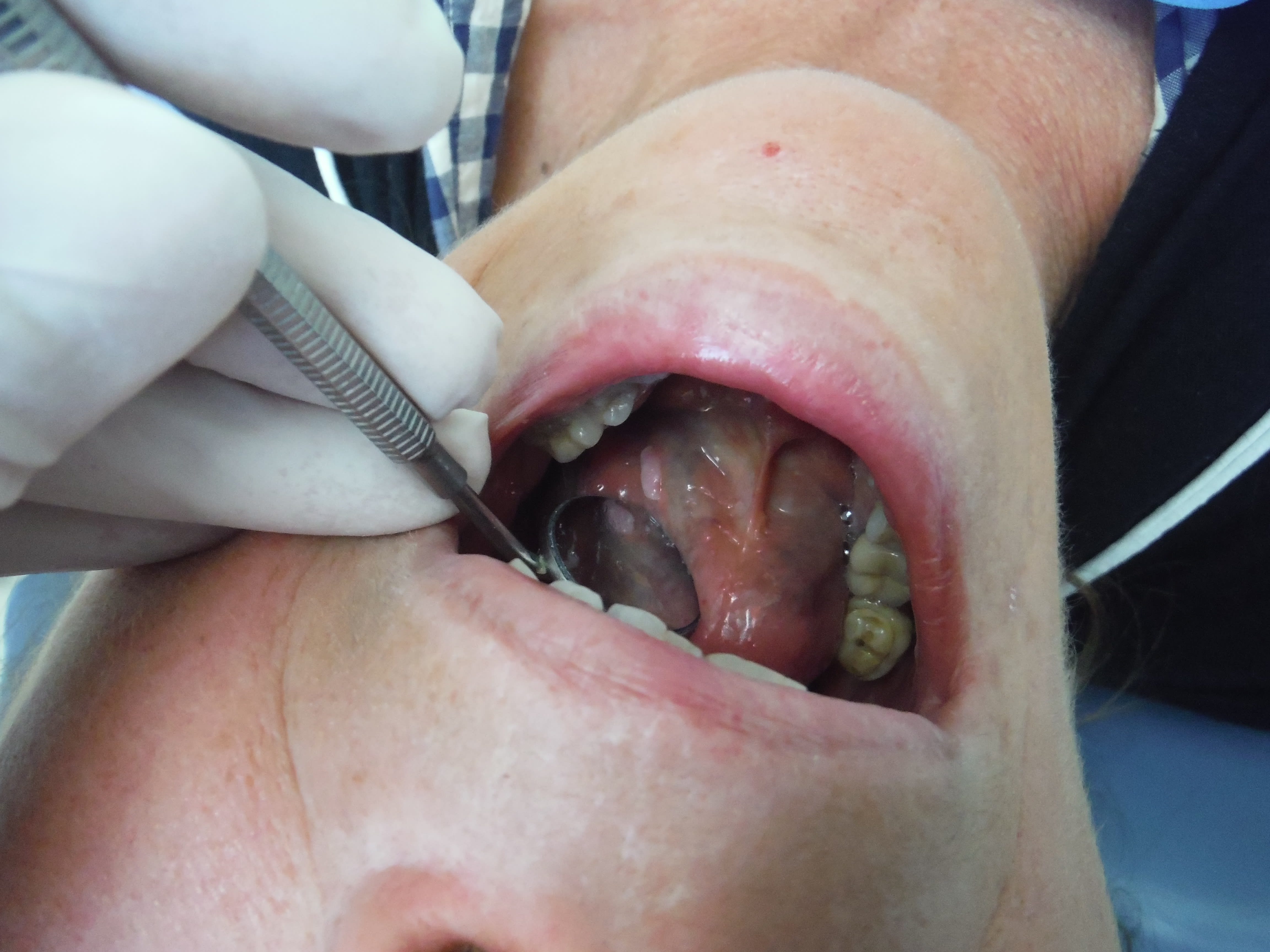Patiente tabagique, un peu alcoolo, vient pour "j'ai l'impression d'avoir un cancer des gencives", forcement un problème paro+tabac c'est pas jojo, j'examine et puis il semble avoir aperçu un truc blanc, furtivement... "levez la langue..." Bingo! En vrai plus blanc que sur les photos et SURTOUT indétectable si on ne regarde pas sous la langue. Bon... exérèse et anapath, je fais pas, j'adresse, pas de chir pas de DASRI;-)))
